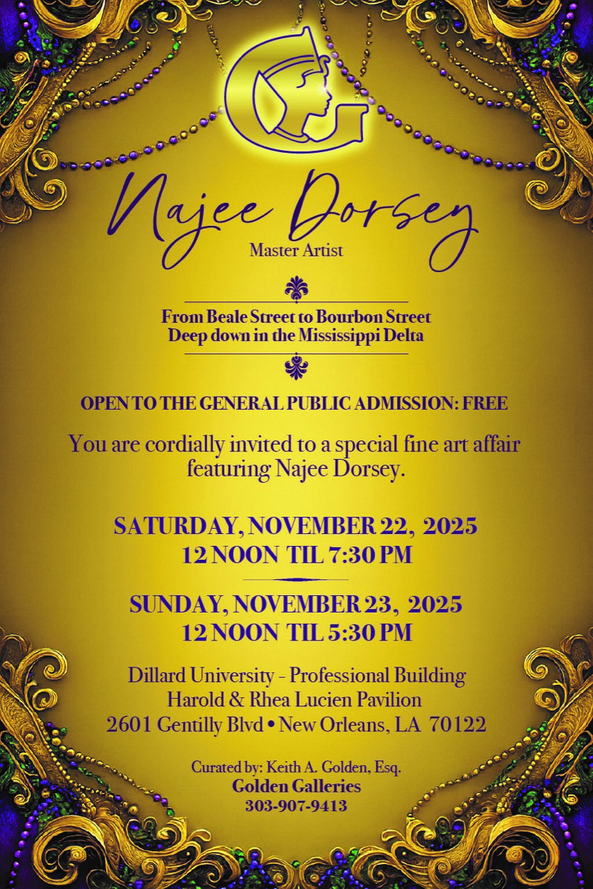 A special fine art exhibition featuring master artist Najee Dorsey, titled “From Beale Street to Bourbon Street: Deep Down in the Mississippi Delta,” will be open to the public with free admission at Dillard University’s Harold & Rhea Lucien Pavilion in New Orleans. The event will take place on Saturday, November 22, 2025, from 12:00 PM to 7:30 PM, and Sunday, November 23, 2025, from 12:00 PM to 5:30 PM. Curated by Keith A. Golden of Golden Galleries, this exhibition invites guests to experience and celebrate Dorsey’s fine art in a welcoming, cultural setting.